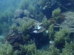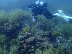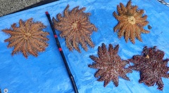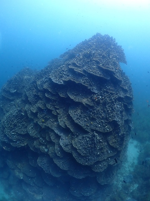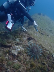 ① 千年サンゴの足元(水深約23メートル) ② 海藻 ③、④ 食痕(白い部分) ⑤ 内湾で駆除したオニヒトデ(サンゴ食害生物) |