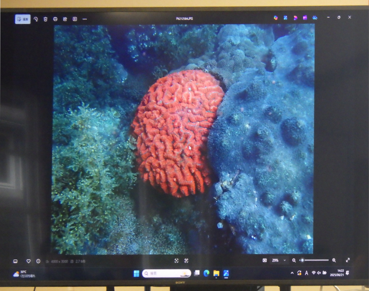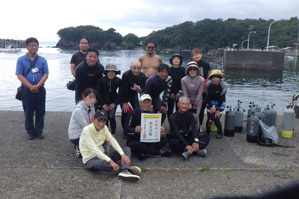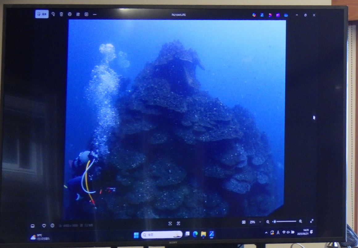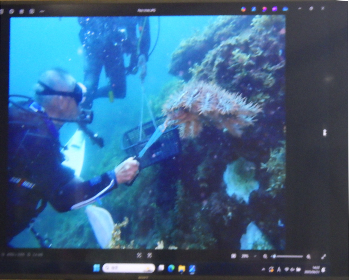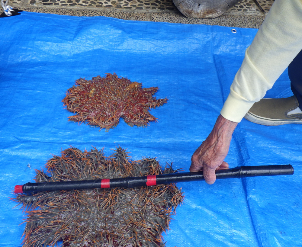 公開日 2025年06月24日 6月21日、牟岐大島内湾・チエバノシタで本年度初となる保全活動を実施しました。 ボランティアダイバーさん9名に御協力いただき、オニヒトデ2匹、食巻貝等49個を駆除しました。 全長30cmを超える巨大なオニヒトデです (赤い目印…短い間隔が10cm・長い間隔が20cm)